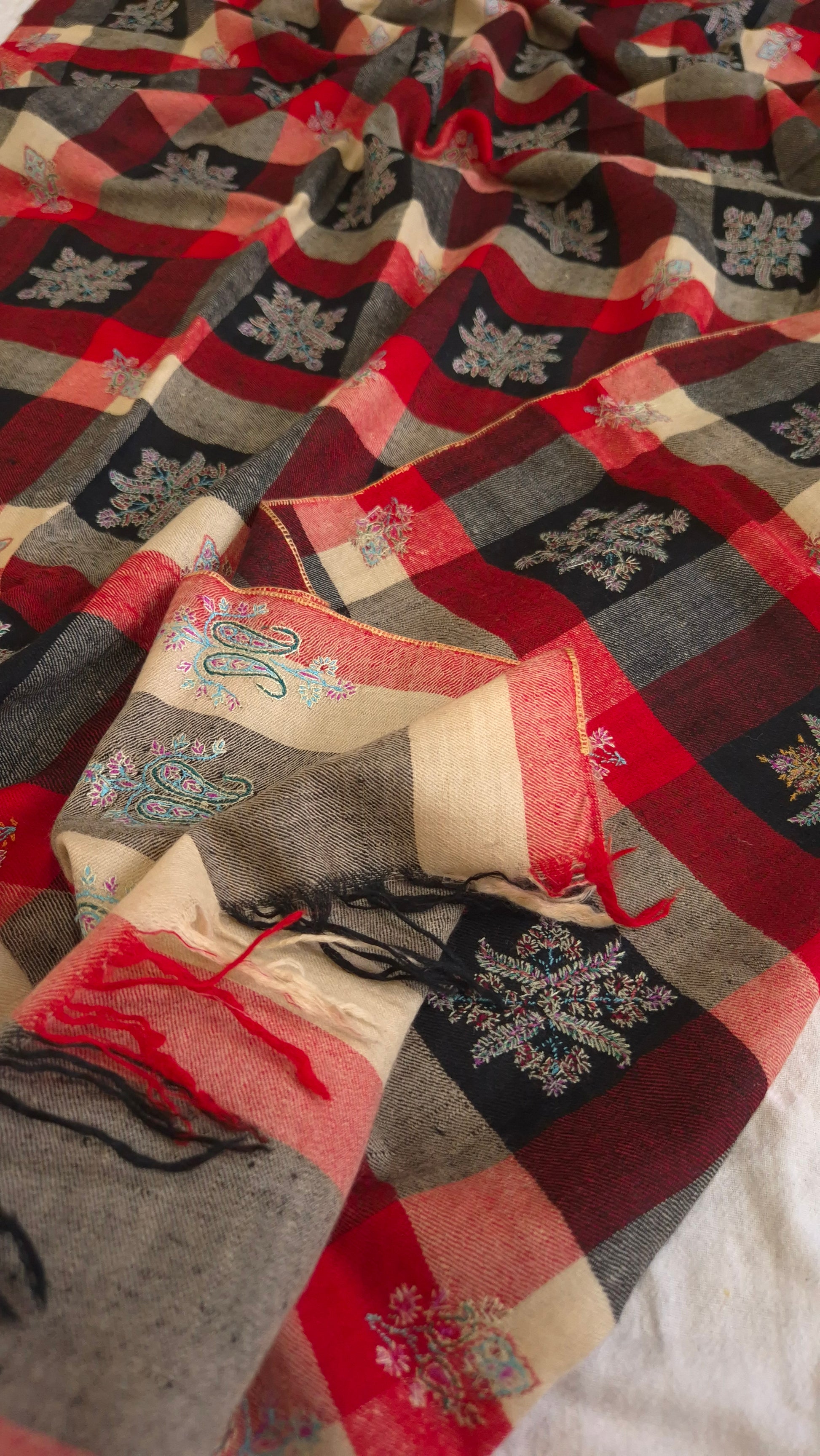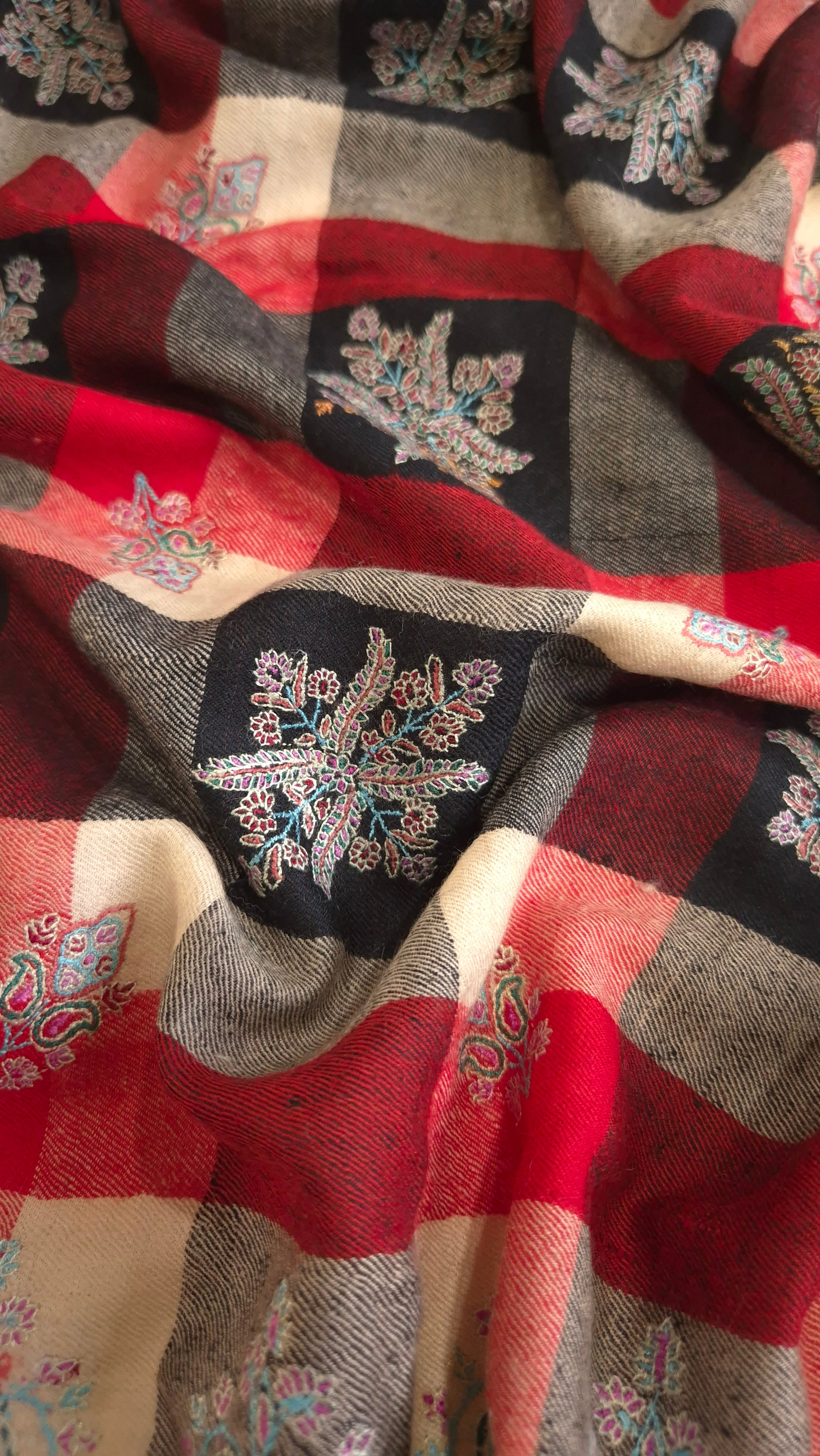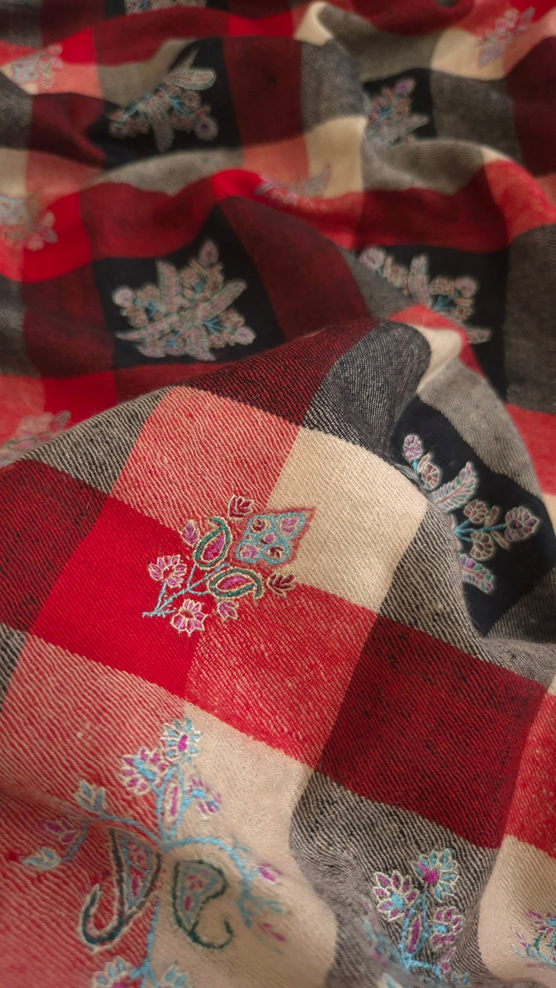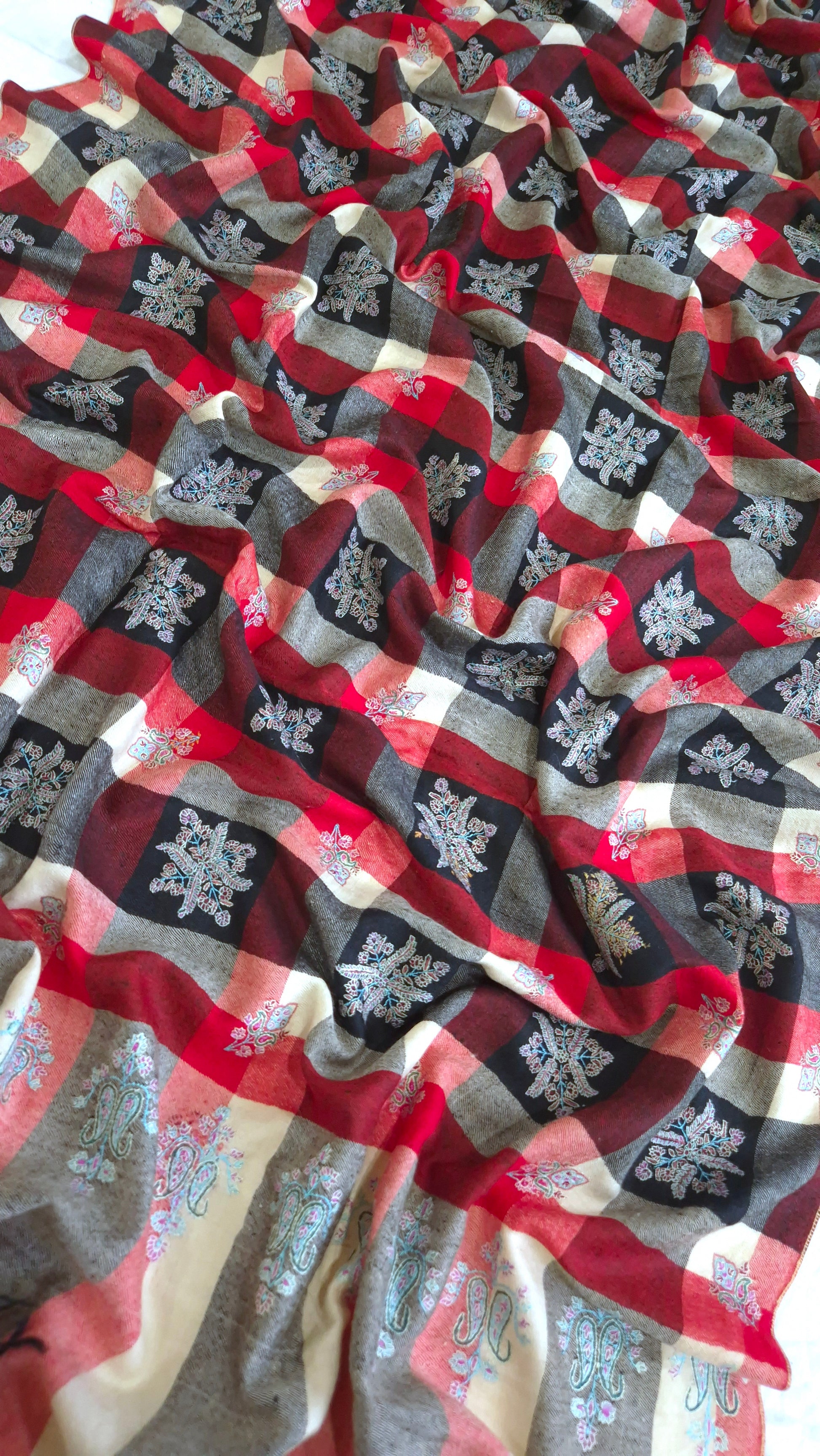 Wrap yourself in timeless Kashmiri elegance with this handcrafted Pashmina shawl. Featuring a striking checkered pattern in rich tones of red, black, ivory, and grey, it is beautifully adorned with intricate Kashmiri embroidery motifs spread across the fabric. The delicate floral and paisley-inspired designs add a touch of artistry, making it a perfect fusion of tradition and modern charm.