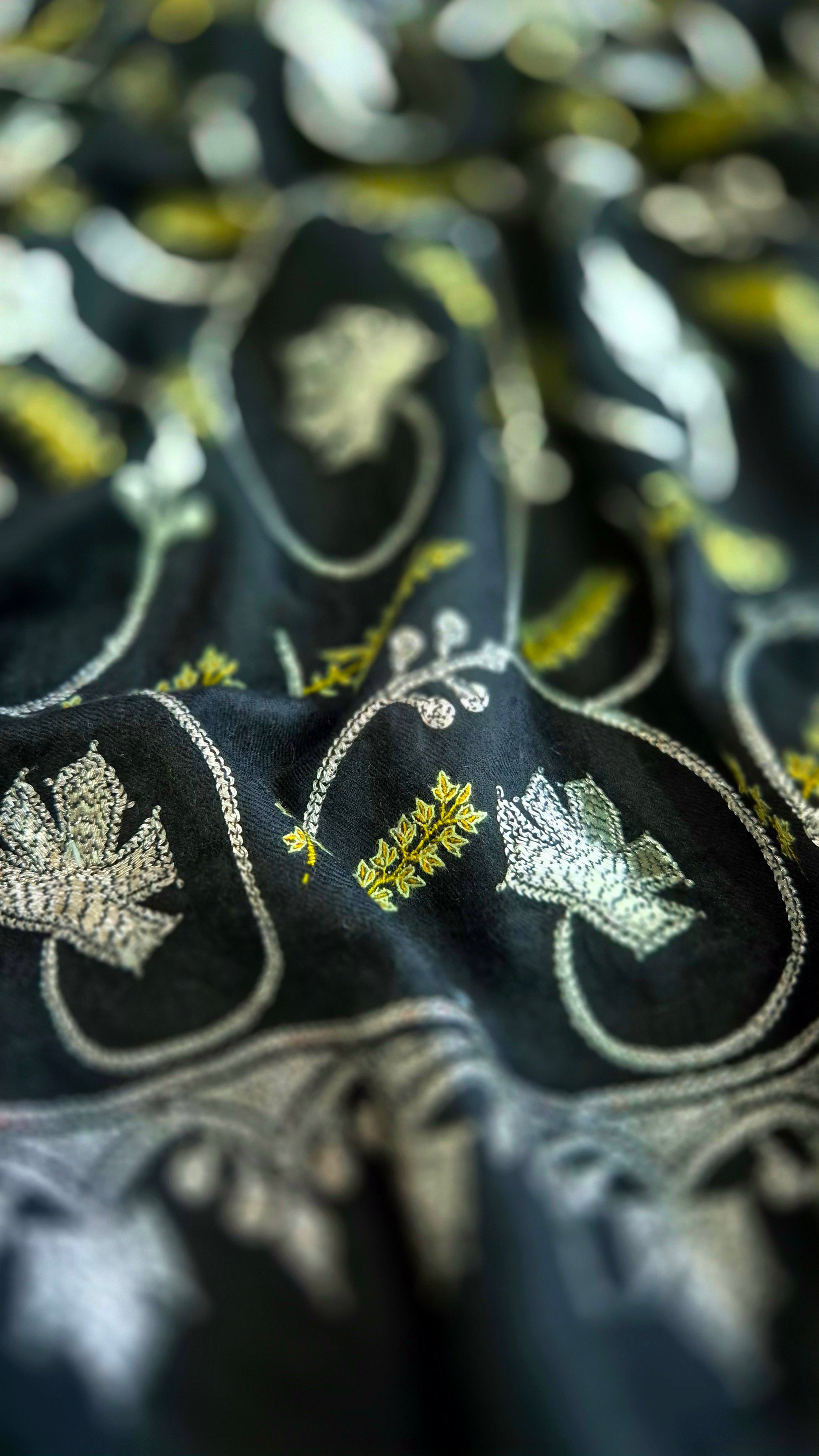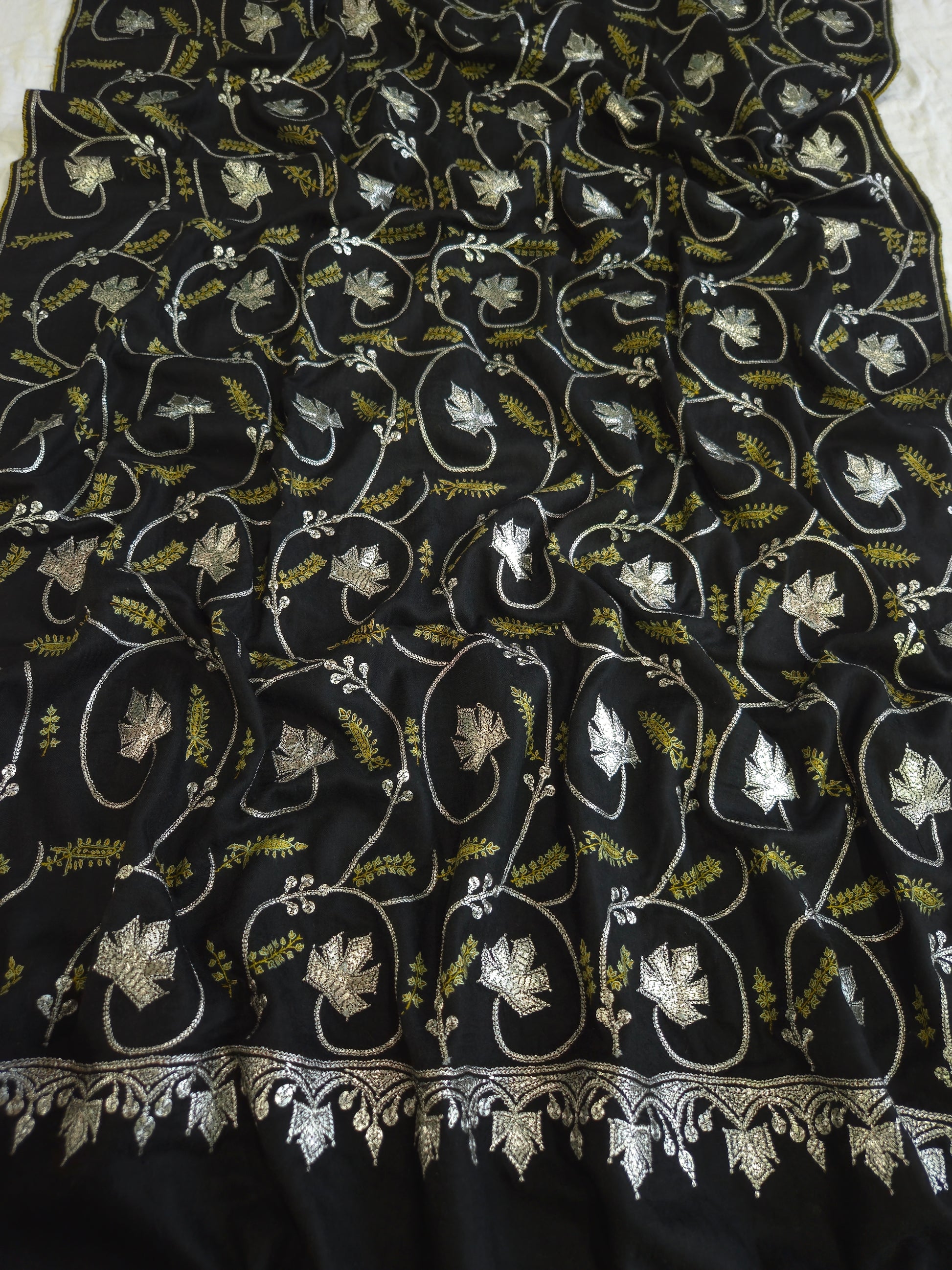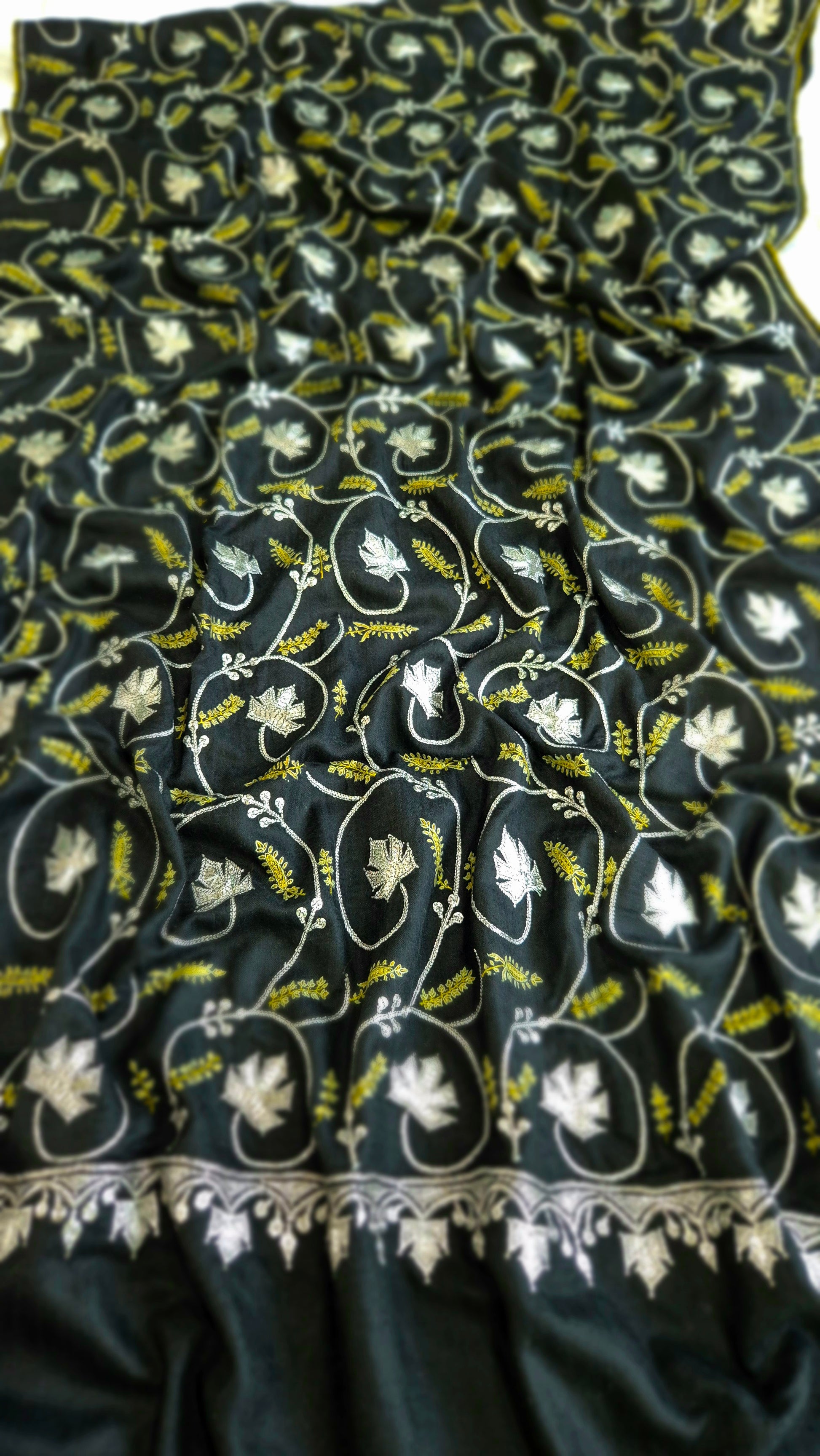 Elevate your wardrobe with the Pashmina Neem Jamavar Shawl, crafted using traditional sozni embroidery techniques and premium neem-colored Jamavar patterns. This shawl combines the softness and warmth of fine pashmina wool with intricate hand-stitched detailing, offering both elegance and lasting comfort. Ideal for formal occasions or adding a refined touch to everyday wear, it exemplifies expert craftsmanship and timeless heritage.